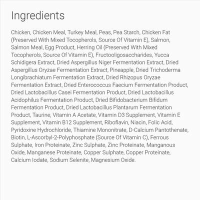 Chicken, Chicken Meal, Turkey Meal, Peas, Pea Starch, Chicken Fat (Preserved with Mixed Tocopherols, Source of Vitamin E), Salmon, Salmon Meal, Egg Product, Herring Oil (Preserved with Mixed Tocopherols, Source of Vitamin E), Fructooligosaccharides, Yucca Schidigera Extract, Dried Aspergillus Niger Fermentation Extract, Dried Aspergillus Oryzae Fermentation Extract, Pineapple, Dried Trichoderma Longibrachiatum Fermentation Extract, Dried Rhizopus Oryzae Fermentation Extract, Dried Enterococcus Faecium Fermentation Product, Dried Lactobacillus Casei Fermentation Product, Dried Lactobacillus Acidophilus Fermentation Product, Dried Bifidobacterium Bifidum Fermentation Product, Dried Lactobacillus Plantarum Fermentation Product, Taurine, Vitamin A Acetate, Vitamin D3 Supplement, Vitamin E Supplement, Vitamin B12 Supplement, Riboflavin, Niacin, Folic Acid, Pyridoxine Hydrochloride, Thiamine Mononitrate, D-Calcium Pantothenate, Biotin, L-Ascorbyl-2-Polyphosphate (Source of Vitamin C), Ferrous Sulphate, Iron Proteinate, Zinc Sulphate, Zinc Proteinate, Manganous Oxide, Manganese Proteinate, Copper Sulphate, Copper Proteinate, Calcium Iodate, Sodium Selenite, Magnesium Oxide.