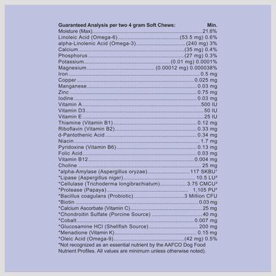 Blueberry Fruit Powder, Cranberry Fruit Powder, Pomegranate Extract Powder, Peanut Butter Powder, Brewers Dried Yeast, Flaxseed, Glycerin, Dried Potato Product, Lecithin, Dried Shellfish Digest, Natural Flavoring, Water, Dicalcium Phosphate, Canola Oil, Maltodextrin, Tapioca Starch, Vitamin E Supplement, Choline Bitartrate, Chondroitin Sulfate, Dried Aspergillus oryzae Fermentation Product, Dried Aspergillus niger Fermentation Solubles, Dried Trichoderma longibrachiatum Fermentation Product, Papaya, Dried Bacillus coagulans Fermentation Product, Fructooligosaccharides, Sorbic Acid (a preservative), Calcium Ascorbate (source of Vitamin C), Mixed Tocopherols (a preservative), Vegetable Oil, Vitamin A Palmitate, Citric Acid (a preservative), Biotin, Zinc Sulfate, Niacin Supplement, Ferrous Sulfate, Vitamin D3 Supplement, Menadione Sodium Bisulfite Complex, Riboflavin, Vitamin B12 Supplement, Pantothenic Acid, Pyridoxine Hydrochloride, Thiamine Mononitrate, Manganese Sulfate, Potassium Iodide, Copper Carbonate, Folic Acid, Cobalt Carbonate, Magnesium Stearate.
