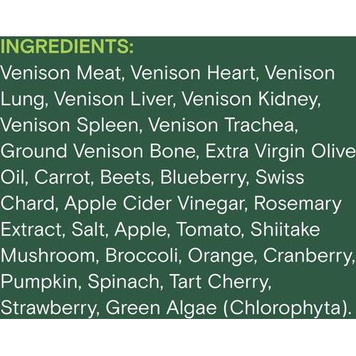 Carne de venado, corazón de venado, hígado de venado, riñón de venado, pulmón de venado, bazo de venado, tráquea de venado, huesos de venado molidos, aceite de oliva virgen extra, zanahoria, remolacha, arándano, acelga, vinagre de manzana, extracto de romero, sal (cloruro de sodio), manzana, tomate, hongo shiitake, brócoli, naranja, arándano rojo, calabaza, espinacas, cereza ácida, fresa,