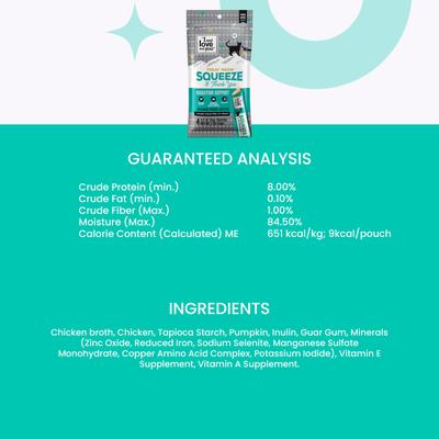 El puré de pollo para apoyar la digestión "I and Love and You Treat Meow" Las golosinas para lamer para gatos están repletas de nutrientes y deliciosos sabores. Puedes servir estas golosinas en puré directamente del sobre o añadirlas a la comida de tu mascota para una comida aún más deliciosa. Están hechas con delicioso pollo de gallinas camperas e ingredientes ricos en fibra como la calabaza y los prebióticos favorecen una digestión saludable. La calabaza ayuda a reducir el exceso de humedad en el tracto digestivo, lo que ayuda a eliminar las inconsistencias de la caja de arena. Su alto contenido de humedad, ideal para lamer los labios, ayuda a cumplir con los objetivos de hidratación diaria de tu gatito, y los ácidos grasos omega-3 y omega-6 ayudan a reducir la inflamación y a promover la salud de la piel y el pelaje.
