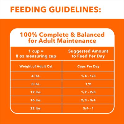 These guideline amounts are a starting point and your cat may need more food depending upon age, activity and temperament. In order to reach optimal body condition, you may need to adjust food intake. This represents the total recommended volume of food per day. You should divide the total recommended feeding amount by the number of times you feed your cat per day to get the actual portion size per feeding.