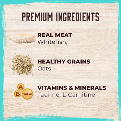 Ocean Whitefish, Fish Broth, Oats, Natural Fish Flavor, Calcium Carbonate, Tricalcium Phosphate, Agar-Agar, Vitamins (Vitamin A Supplement, Vitamin E Supplement, Niacin Supplement, D-Calcium Pantothenate, Thiamine Mononitrate, Pyridoxine Hydrochloride, Riboflavin Supplement, Folic Acid, Vitamin B12 Supplement), Salt, Choline Chloride, Minerals (Zinc Proteinate, Iron Proteinate, Copper Proteinate, Manganese Proteinate, Sodium Selenite, Calcium Iodate) Taurine, Potassium Chloride.