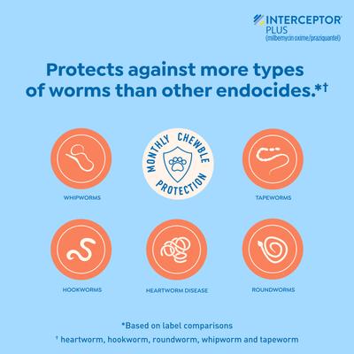 INTERCEPTOR PLUS is indicated for the prevention of heartworm diseasecaused by Dirofilaria immitis; and for the treatment and control of adultroundworm (Toxocara canis, Toxascaris leonina), adult hookworm(Ancylostoma caninum), adult whipworm (Trichuris vulpis), and adult tapeworm(Taenia pisiformis, Echinococcus multilocularis, Echinococcus granulosus,and Dipylidium caninum) infections in dogs and puppies two pounds of bodyweight or greater and six weeks of age and older.