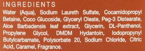 Water (Aqua), Sodium Laureth Sulfate, Cocamidopropyl Betaine, Cocoglucoside, Glyceryl Oleate, Peg-3 Distearate, Aloe Barbadensis Leaf Juice, Glycerin, Panthenol, Propylene Glycol, DMDM Hydantoin, lodopropynyl Butylcarbamate, Polysorbate 20, Sodium Chloride, Citric Acid, Caramel Coloring, Fragrance (Perfume).