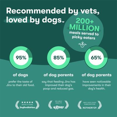 Every dog is different, so transition times vary. To avoid any surprises, we recommend mixing Jinx kibble in gradually, increasing the amount over a two-week period. This helps your pet's digestive tract adapt to new ingredients. Keep an eye on their #2, as you will notice slight changes in color, or loose stool that can occur during transition. Hold off on increasing the amount of new kibble until their stool returns to what you're used to. Continue this process until they're eating 100% Jinx.