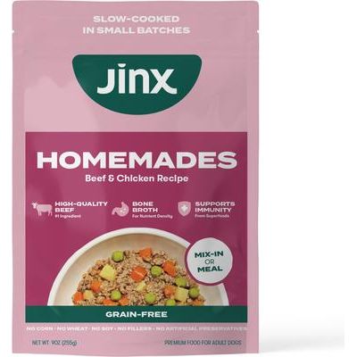 Si lo usa como alimento principal de su perro, haga la transición a Jinx durante un período de 2 semanas, aumentando gradualmente la cantidad de Jinx y disminuyendo la cantidad del alimento anterior cada día. Esto le dará tiempo al sistema digestivo de su perro para adaptarse a su nueva dieta. Si lo usa como aderezo o mezcla para sus comidas, aumente gradualmente la cantidad de Jinx Homemades en cada comida hasta alcanzar la proporción deseada.