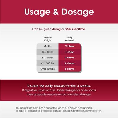 Administer soft chew directly to dog. Can be given during or after mealtime. Double the daily amount for first 3 weeks. If digestive upset occurs, taper dosage for a few days then gradually resume recommended dosage.