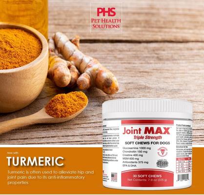 If your senior sweetie suffers from joint pain and soreness resulting from regular activity and exercise, he may need a maximum dose of support. Joint MAX Triple Strength Soft Chew Joint Supplement for Dogs features a unique blend of ingredients specially selected to improve every aspect of joint health–lubrication, cushioning of tissues and maintaining cartilage, connective tissues and bones. The paw-erful active ingredients—like glucosamine, chondroitin, antioxidants, and omega-3 fatty acids—enhance your BFF’s joint and connective tissue structure and function and reduce oxidative stress. Most importantly, the highly palatable chews help reduce mobility issues and keep your dog active longer. Soft chews can be taken with prescription medication.
