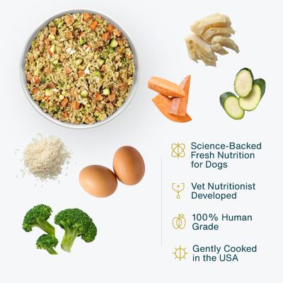 - Elaborado con ingredientes frescos de grado humano, que incluyen bacalao de Alaska capturado en la naturaleza, arroz blanco de grano largo, batatas, huevos de gallina, brócoli y calabacín.