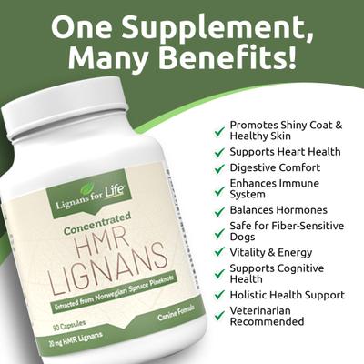 Give your furry friend the gift of balanced hormones with K9 Select Lignans for Life 20-mg HMR Capsules Hormone Supplement for Dogs. This natural, plant-based supplement is designed to support the health and well-being of dogs and is especially beneficial for elderly pets and females of all breeds. Derived from the Norwegian spruce tree, HMR lignans are rich in phytoestrogens, which help regulate hormone levels and reduce excessive cortisol production. This supplement also assists in reversing issues like excessive thirst, frequent urination, ravenous appetite, and hair loss. And it may support skin and coat health, reproductive organ health, and healthy cortisol levels.