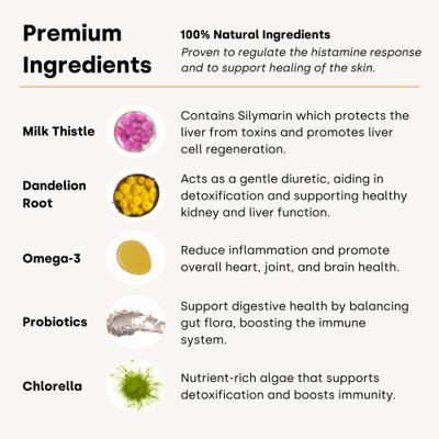 Active Ingredients:Milk Thistle, Omega 3, Probiotics, Bee Pollen, Dandelion Root, Vitamin C, Chlorella, GABA, Spirulina, Vitamin E.