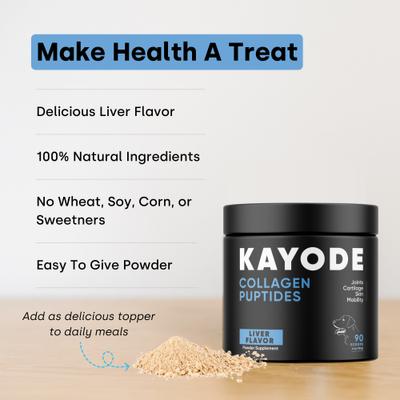 Help your senior pup feel like a puppy again with the Kayode Collagen Puptides Liver Flavored Powder Joint Supplement for Senior Dogs. Collagen is a crucial protein that naturally declines with age, causing issues like joint pain and arthritis. But with this supplement, you can help rebuild your pup’s tissue and cartilage, unlike other joint supplements that only address inflammation. Studies have shown that collagen is more effective than glucosamine in reducing arthritis symptoms and pain. Marine collagen in this supplement also helps keep your dog’s skin moisturized, elastic, and healthy. In just a few weeks, you’ll notice a softer, silkier coat that’s perfect for cuddling. This supplement also includes hyaluronic acid and vitamin C which work together to enhance the effects of collagen. It’s also soft to chew and made with safe, tasty ingredients your dog will love!