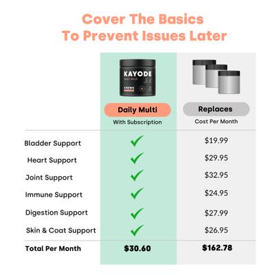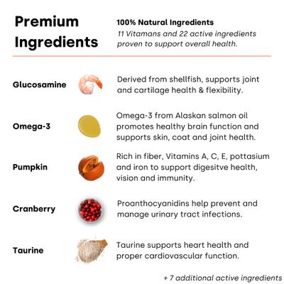 Active Ingredients:Pumpkin, Glucosamine, Chondroitin, Postbiotics, Essential Vitamins, Taurine, Cranberry.