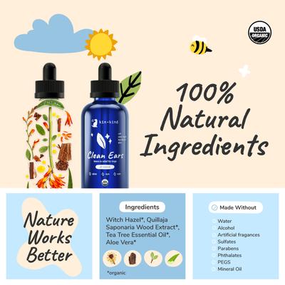 - Elimina la cera y los olores: Los oídos húmedos y con cera provocan infecciones bacterianas y por hongos, mal olor, irritación y mucho rascado. Elimina los olores y la acumulación de cera de forma natural con kin+kind Clean Ears.