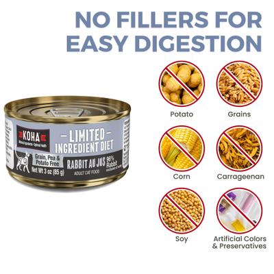 Koha Limited Ingredient Diet Rabbit Au Jus Grain-Free Paté Wet Cat Food is the perfect choice for pet parents looking to help their feline friends thrive. With one animal protein, this limited ingredient wet cat food is ideal for felines with extreme food sensitivities, digestive issues, and sensitive stomachs. Say goodbye to junky fillers like potatoes, wheat, corn, soy, and carrageenan that can cause digestive problems. This recipe also includes the beneficial ingredients of pumpkin for healthy digestion, and cranberries for urinary tract support. The paté texture and delicious taste make it a favorite among cats, while the easy-to-digest formula keeps their stomachs happy and their purrs aplenty. Plus, the grain-free formula ensures that your pet is getting a high protein, moisture-rich meal without any unnecessary fillers.