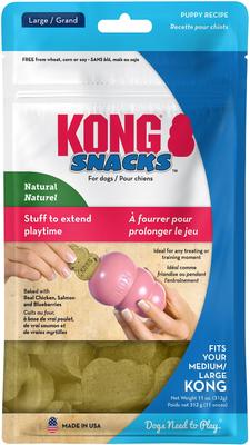 Indulge your playful puppy with the irresistible chicken liver flavor even the pickiest puppies can’t resist with the KONG Stuff'N Puppy Snacks Dog Treats. Your growing little one will feel pampered with these tasty and nutritious biscuit-shaped delights, while you will feel good about rewarding her with a low-fat, 100% natural treat. With no wheat, corn, or soy, the formula is specially formulated for puppies’ sensitive tummies and includes high-quality, natural ingredients like chicken liver, cheddar cheese, and apples. Plus, they’re the perfect shape and size to stuff into your pup’s favorite KONG Puppy rubber toy for hours of lasting and rewarding play!
