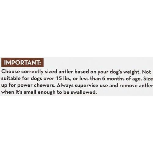 Elija la talla correcta de asta según el peso de su perro. No apto para perros de 13.6 kg o menores de 6 meses. Para perros que mastican con fuerza, elija una talla mayor. Supervise siempre su uso y retire la cornamenta cuando sea lo suficientemente pequeña como para ser tragada.
