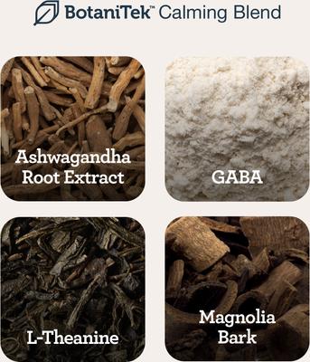 Active Ingredients: Proprietary BotaniTek Calming Blend, Ashwaghanda (Withania Somnifera) Extract, Brewers Yeast, Chamomile (Matricaria Chamomilla), GABA (Gamma-Aminobutyric Acid), Ginger Root (Zingiber Officinale), L-Theanine, L-Tryptophan, Magnolia Bark (Magnolia Officinalis), Passion Flower (Passiflora) Extract, Pyridoxine HCL Powder (B6), Thiamine Mononitrate (B1), Broad Spectrum Hemp Extract.