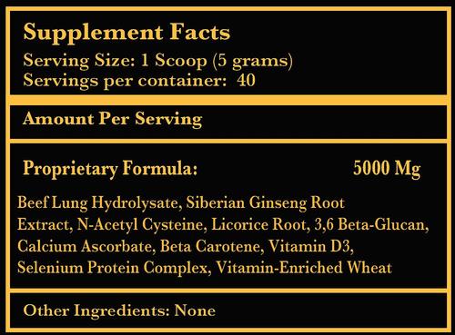 Beef Lung Hydrolysate, Siberian Ginseng Extract, N-Acetyl Cysteine, Licorice Root, 3,6 Beta Glucan, Calcium Ascorbate, Beta Carotene, Vitamin D3, Selenium Protein Complex, Vitamin-Enriched Wheat