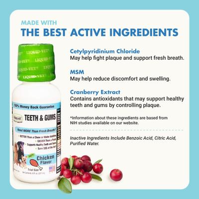 Liquid-Vet Teeth & Gums Support Chicken Flavor Dog Supplement is designed for canine companions who need more than just fresh breath. This liquid supplement contains active ingredients to support his overall dental health. Your buddy will love the natural chicken flavor, and you’ll appreciate how easy it is to add to his daily meal—no mixing required!