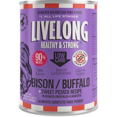 Dale a tu peludo el sabor del auténtico marisco con la comida húmeda para perros Livelong Healthy & Strong con salmón y boniato. Esta comida natural para perros está hecha con salmón como ingrediente principal. Es ideal para perros de todas las razas en cualquier etapa de su vida y no contiene cereales, gluten, saborizantes artificiales ni conservantes. Este alimento húmedo para perros contiene un 90 % de carne y está elaborado al estilo paté con deliciosas verduras orgánicas. Se fabrica con orgullo en EE. UU. y se presenta en una caja de 12 latas de 355 ml para nutrir a tu mascota.