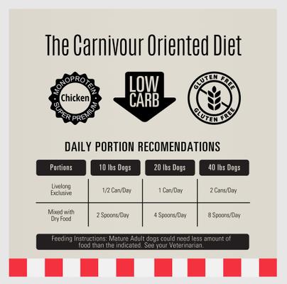 If fed solely, feed one Livelong Healthy & Strong STAGES 12.5 oz can a day for every 20 lbs. of body weight. Adjust as needed for your DOG’s age & activity and to mantain healthy body condition. Reduce amounts if necessary for less active and older dogs