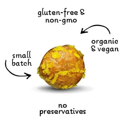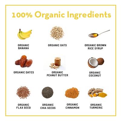 Organic Oats, Organic Brown Rice Syrup, Organic Date, Organic Peanut Butter, Organic Banana, Organic Coconut, Organic Flax Seed, Organic Chia Seed, Organic Cinnamon, Organic Turmeric.