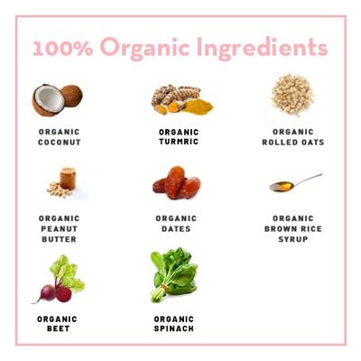 Organic Oats, Organic Brown Rice Syrup, Organic Date, Organic Peanut Butter, Organic Coconut (Organic Turmeric, Organic Beet, Organic Spinach)