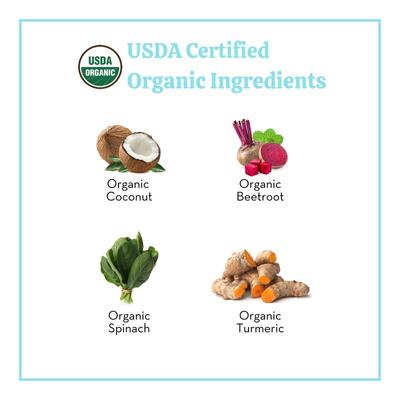 Organic Coconut, Organic Tumeric, Organic Spinach, Organic Beet