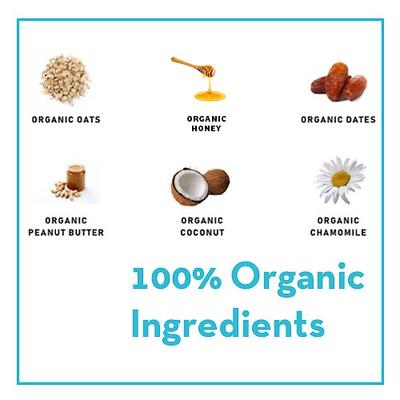 Organic Oats, Organic Honey, Organic Date, Organic Peanut Butter, Organic Coconut, Organic Chamomile.