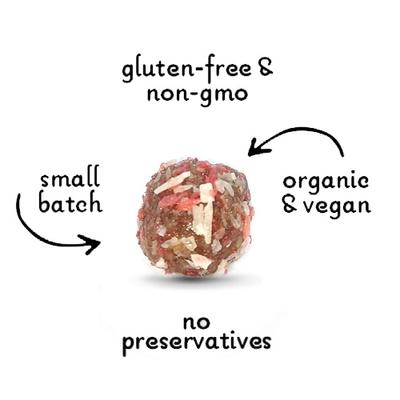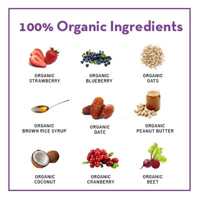 Organic Oats, Organic Brown Rice Syrup, Organic Date, Organic Peanut Butter, Organic Coconut, Organic Blueberry, Organic Strawberry, Organic Cranberry, Organic Beet.