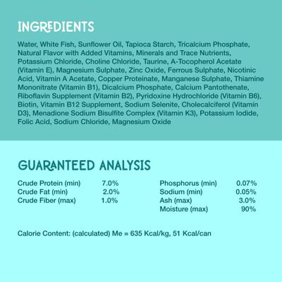 Water, White Fish, Sunflower Oil, Tapioca Starch, Natural Flavor, Taurine, Tricalcium Phosphate, Potassium Chloride, Choline Chloride, A-Tocopherol Acetate (Vitamin E), Magnesium Sulphate, Zinc Oxide, Ferrous Sulphate, Nicotinicacid, Vitamin A Acetate, Copper Proteinate, Manganese Sulphate, Thiamine Mononitrate (Vitamin B1), Dicalcium Phosphate, Calcium Pantothenate, Riboflavin Supplement (Vitamin B2), Pyridoxine Hydrochloride (Vitamin B6), Biotin, Vitamin B12 Supplement, Sodium Selenite, Cholecalciferol (Vitamin D3), Menadione Sodium Bisulfite Complex (Vitamin K3), Potassium Iodide, Folic Acid, Magnesium Oxide.