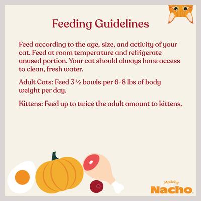 Daily Feeding: Adult: Feed 3 1/2 bowls per 8 lbs. of body weight per day. Kitten: feed up to twice the adult amount to kittens. Feed according to the age, size and activity of your cat. Feed at room temperature and refrigerate the unused portion. Your cat should always have access to clean, fresh water.