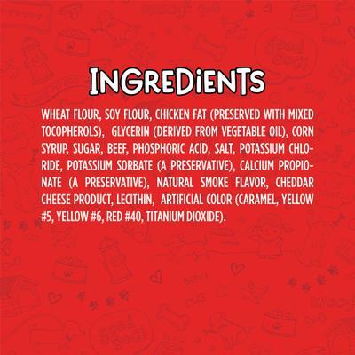 Wheat Flour, Soy Flour, Chicken Fat (Preserved With Mixed Tocopherols), Glycerin (Derived From Vegetable Oil), Corn Syrup, Sugar, Beef, Phosphoric Acid, Salt, Potassium Chloride, Potassium Sorbate (A Preservative), Calcium Propionate (A Preservative), Natural Smoke Flavor, Cheddar Cheese Product, Lecithin, Artificial Color (Caramel, Yellow #5, Yellow #6, Red #40, Titanium Dioxide).