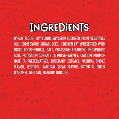 Wheat Flour, Soy Flour, Glycerin (Derived From Vegetable Oil), Corn Syrup, Sugar, Beef, Chicken Fat (Preserved With Mixed Tocopherols), Salt, Potassium Chloride, Phosphoric Acid, Potassium Sorbate (A Preservative), Calcium Propionate (A Preservative), Rosemary Extract, Natural Smoke Flavor, Lecithin, Natural Steak Flavor, Artificial Color (Caramel, Red #40, Titanium Dioxide).