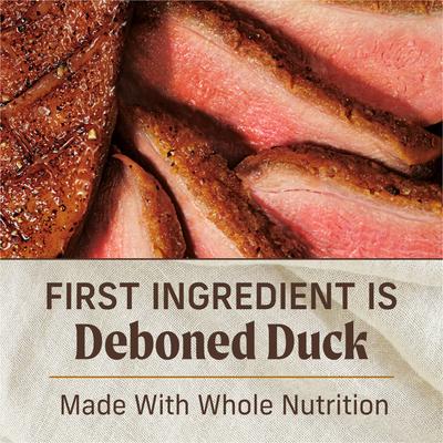 - Real deboned duck is the first ingredient in this grain-free wet recipe, plus it features added vitamins, minerals, and nutrients.