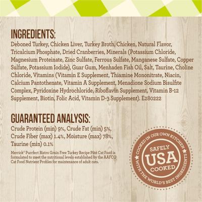 Crafted for felines who appreciate the finer things, Merrick Purrfect Bistro Grain-Free Wet Cat Food Turkey Recipe Pate is a full-flavored, delectably smooth pate that's sure to tempt even the most persnickety kitty! This high-protein cat food is made with real, deboned turkey as the first ingredient. The natural, high-quality ingredients are finely ground into a smooth pate with the meaty taste cats love. Taurine, vitamins, and minerals go in, too, providing the essential nutrition your adult cat needs to thrive. For a truly delicious and filling meal, this recipe is made free from corn, wheat, and soy and contains no artificial colors, flavors, or preservatives. All Merrick recipes are crafted in their Hereford, Texas kitchen and cooked in the USA.