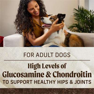 - Support your barking BFF’s health with kibble that contains omega-6 and omega-3 fatty acids to nourish their skin and coat and glucosamine and chondroitin for healthy hips and joints.
