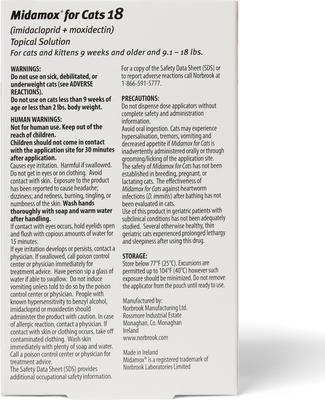 Meet Midamox for Cats (imidacloprid + moxidectin) topical solution from Norbrookthe effective, affordable bioequivalent to Advantage Multi for Cats (imidacloprid + moxidectin) that prevents heartworm disease, treats flea infestations and treats and controls several other parasites.