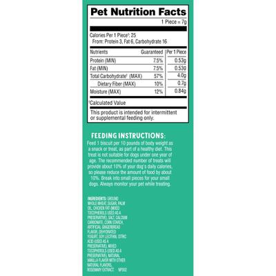 Feed 1 biscuit per 10 pounds of body weight as a snack or treat, as part of a healthy diet. This treat is not suitable for dogs under one year of age. The recommended number of treats will provide about 10% of your dog's daily calories, so please reduce the amount of food by about 10%. Break into small pieces for your small dogs. Always monitor your pet while treating. This product is intended for intermittent or supplemental feeding only. Keep clean water available at all times.
