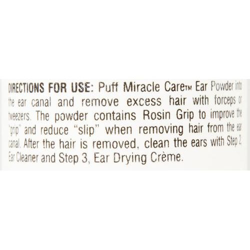 Aplicar el polvo R-7 Ear Powder en el canal auditivo y retirar el exceso de vello con pinzas. El polvo contiene Rosin Grip para mejorar el agarre y reducir el deslizamiento al retirar el vello del canal auditivo. Después de retirar el vello, limpie las orejas con el Paso 2, Limpiador de oídos R-7® y el Paso 3, Crema para secar oídos R-7®.