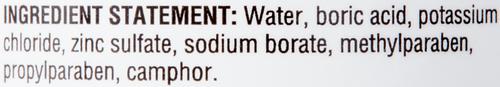 Water,Boric Acid,Potassium Chloride, Zinc Sulfate,Sodium Borate,Methyl Paraben, Propyl Paraben and Camphor.
