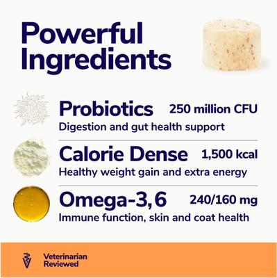 - This supplement chew supports metabolism and encourages your furry friend to eat more and get more out of its nutrition.