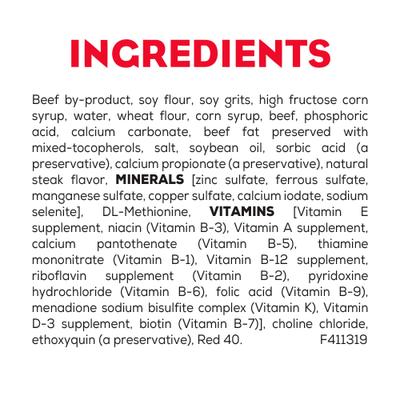 Beef By-Product, Soy Flour, Soy Grits, High Fructose Corn Syrup, Water, Wheat Flour, Corn Syrup, Beef, Phosphoric Acid, Calcium Carbonate, Beef Fat Preserved With Mixed-Tocopherols, Salt, Soybean Oil, Sorbic Acid (A Preservative), Calcium Propionate (A Preservative), Natural Steak Flavor, Minerals [Zinc Sulfate, Ferrous Sulfate, Manganese Sulfate, Copper Sulfate, Calcium Iodate, Sodium Selenite], Dl-Methionine, Vitamins [Vitamin E Supplement, Niacin (Vitamin B-3), Vitamin A Supplement, Calcium Pantothenate (Vitamin B-5), Thiamine Mononitrate (Vitamin B-1), Vitamin B-12 Supplement, Riboflavin Supplement (Vitamin B-2), Pyridoxine Hydrochloride (Vitamin B-6), Folic Acid (Vitamin B-9), Menadione Sodium Bisulfite Complex (Vitamin K), Vitamin D-3 Supplement, Biotin (Vitamin B-7)], Choline Chloride, Ethoxyquin (A Preservative), Red 40. F411319.