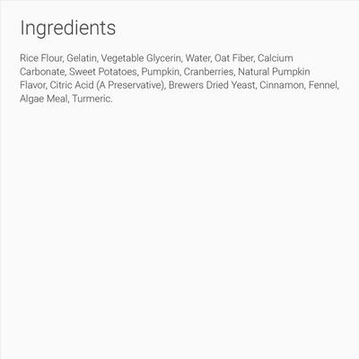 Rice Flour, Gelatin, Vegetable Glycerin, Water, Oat Fiber, Calcium Carbonate, Sweet Potatoes, Pumpkin, Cranberries, Natural Pumpkin Flavor, Citric Acid (A Preservative), Brewers Dried Yeast, Cinnamon, Fennel, Algae Meal, Turmeric.