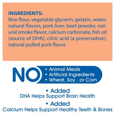 Rice Flour, vegetable glycerin, gelatin, water, natural flavors, pork liver, beet powder, natural smoke flavor, calcium carbonate, fish oil (source of DHA), citric acid (a preservative), natural pulled pork flavor.