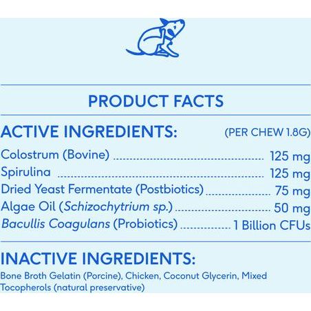Ingredientes activos: Calustro, espirulina, calostro, fermento de levadura seca, aceite de algas, Bacullis coagulans.