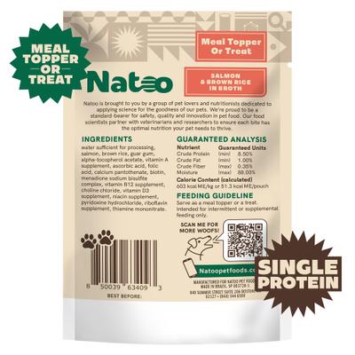 Natoo’s Salmon with Brown Rice Limited Ingredient Dog Food Topper is the perfect addition to your pup’s meals. Featuring healthy ingredients that dogs naturally crave, this limited-ingredient recipe is packed with body-fueling protein to promote a strong immune system and provide energy for dogs of all sizes and breeds. Crafted in solar-powered kitchens in Brazil, this topper is good for your pup and the environment.