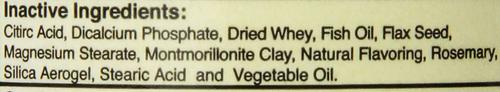 Inactive Ingredients: Citric Acid, Dicalcium Phosphate, Dried Whey, Fish Oil, Flax Seed, Magnesium Stearate, Montmorillonite Clay, Natural Flavoring, Rosemary Extract, Silica Aerogel and Stearic Acid.