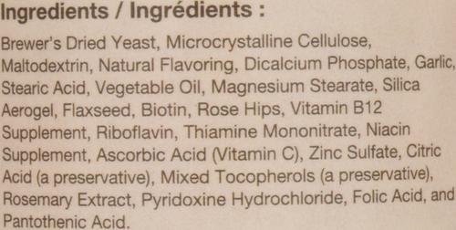 Brewer's Dried Yeast, Microcrystalline Cellulose, Maltodextrins, Natural Flavoring, Dicalcium Phosphate, Garlic, Stearic Acid, Vegetable Oil, Non-Fat Dry Milk, Kaolin, Magnesium Stearate, Dried Whey, Flax Seed, Biotin, Rose Hips, Vitamin B12 Supplement, Silica Aerogel, Riboflavin, Thiamine Mononitrate, Niacin Supplement, Ascorbic Acid (Vitamin C), Rosemary, Citric Acid (a Preservative), Zinc Sulfate, Pyridoxine Hydrochloride, Folic Acid, and Pantothenic Acid.